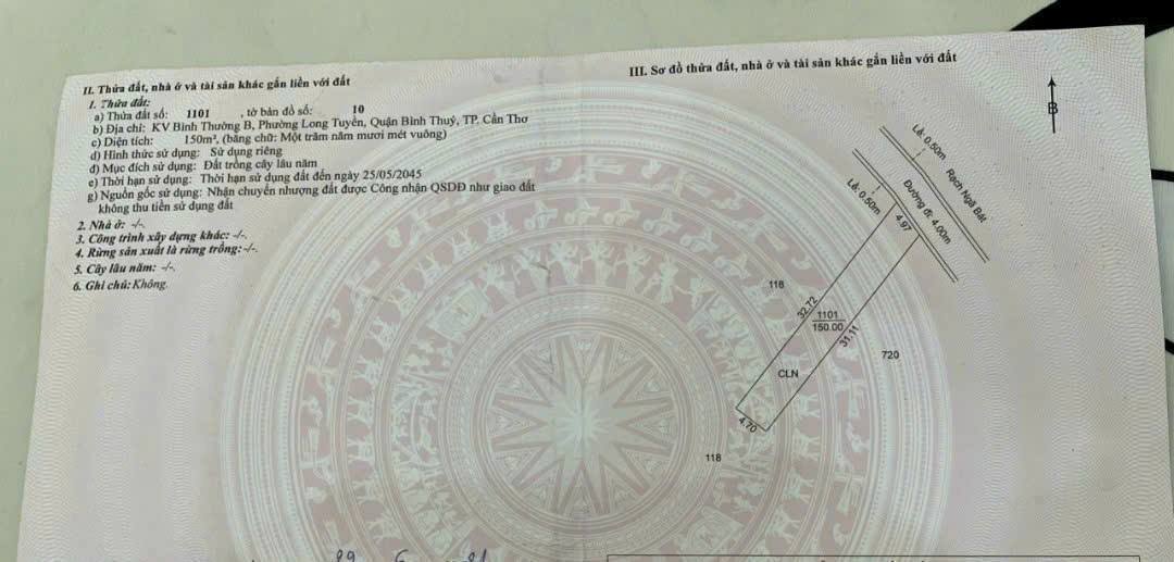 Một nền đất rộng 359m² tại Rạch Ngã Bát, đường Vườn Mận, phường Long Tuyền, Cần Thơ, đang được rao bán với mức giá 2,35 tỷ đồng. Vị trí tiềm năng này gần các trục đường lớn, lý tưởng cho đầu tư và xây dựng.