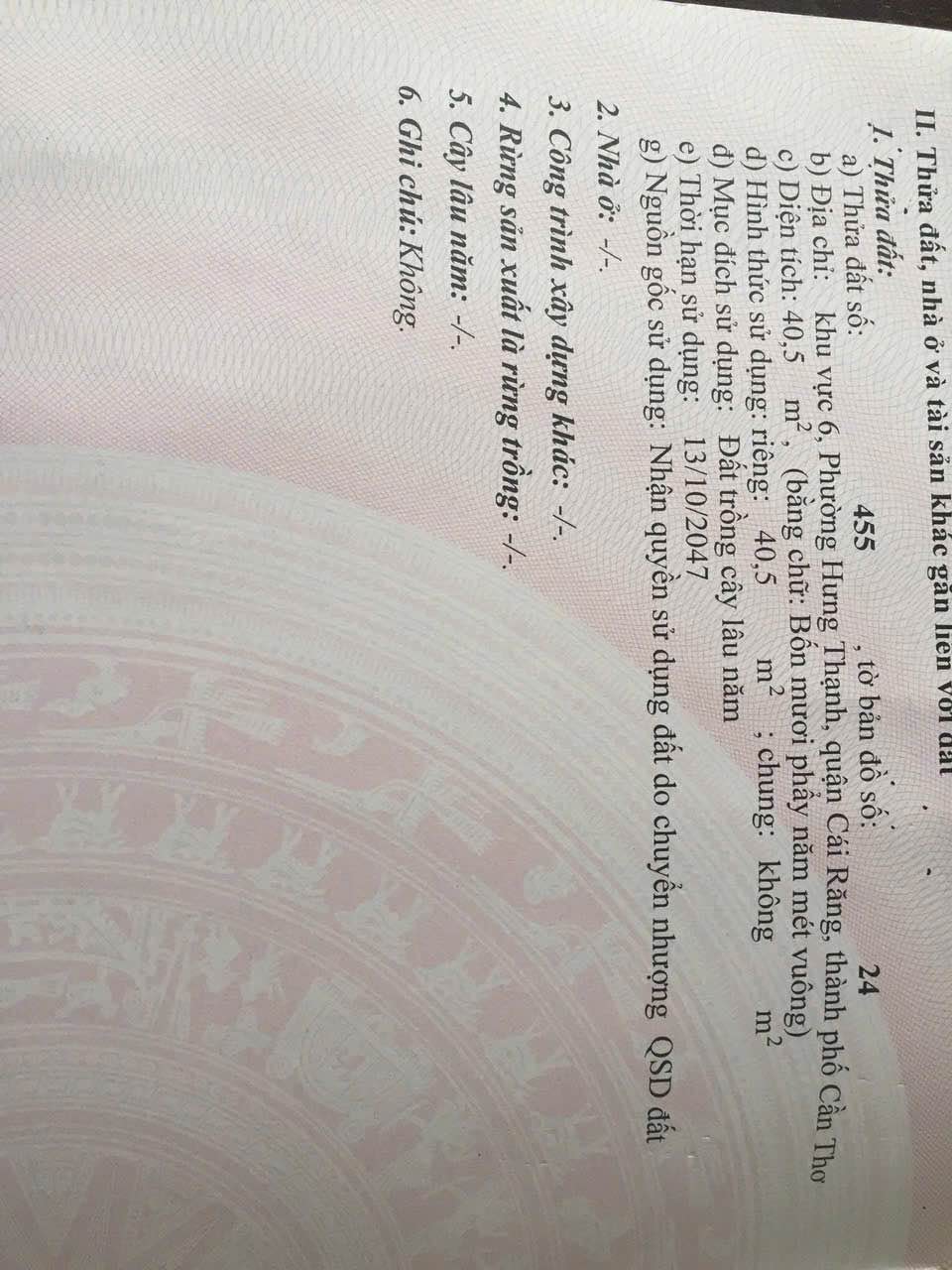 Chính chủ hiện đang rao bán hai nền đất có vị trí đắc địa, tọa lạc đối diện Khu dân cư Hồng Loan, thuộc khu vực 6, phường Hưng Thạnh, quận Cái Răng, thành phố Cần Thơ. Đây là khu vực có tốc độ phát triển ổn định, thu hút sự quan tâm của nhiều nhà đầu tư và người dân tìm kiếm nơi an cư.