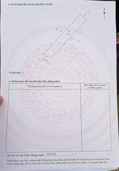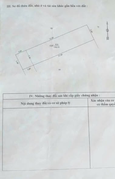 - Diện tích: Với chiều rộng 5.40m và chiều dài 25m, tổng diện tích là 136m². Hiện trạng là đất cây lâu năm (CLN).