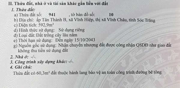 - Loại đất: Đất cây lâu năm, phù hợp cho việc trồng trọt các loại cây công nghiệp, cây ăn trái hoặc chuyển đổi mục đích sử dụng trong tương lai (tùy thuộc quy hoạch địa phương và quy định pháp luật hiện hành).