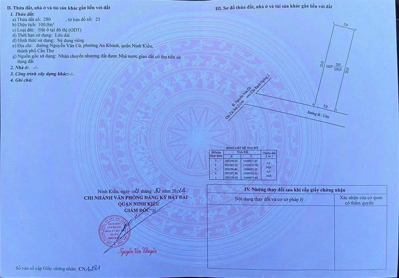 Nền đất có địa chỉ tại nhánh Hẻm Liên Tổ 3-4 đường Nguyễn Văn Cừ, khu vực yên tĩnh nhưng vẫn giữ được kết nối thuận tiện đến các trục đường chính. Với diện tích 100m², kích thước chuẩn ngang 5m dài 20m, nền đất rất vuông vắn và lý tưởng cho việc thiết kế, xây dựng nhiều kiểu kiến trúc khác nhau, từ nhà ở gia đình đến các dãy phòng trọ cho thuê. Lộ giới trước nền đất là 3m, đủ rộng cho xe cộ di chuyển và tiếp cận, đảm bảo tính tiện lợi trong sinh hoạt hàng ngày.