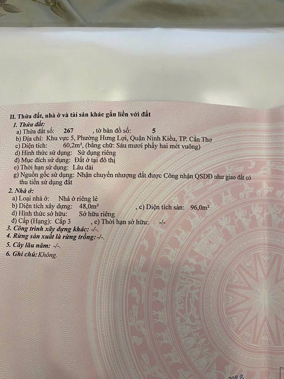 Bán nhà trung tâm Ninh Kiều, Cần Thơ, vị trí đắc địa gần Đại học Cần Thơ. Ngôi nhà sở hữu diện tích sử dụng 110m², kết cấu hiện đại, đã hoàn công đầy đủ, sẵn sàng bàn giao. Đây là lựa chọn lý tưởng cho cuộc sống tiện nghi tại khu vực an ninh, sầm uất.