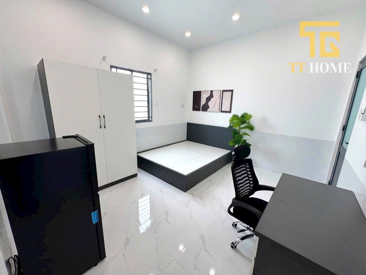 - Phòng đã có sẵn máy lạnh, tủ lạnh, giường, tủ quần áo và bàn ghế làm việc.