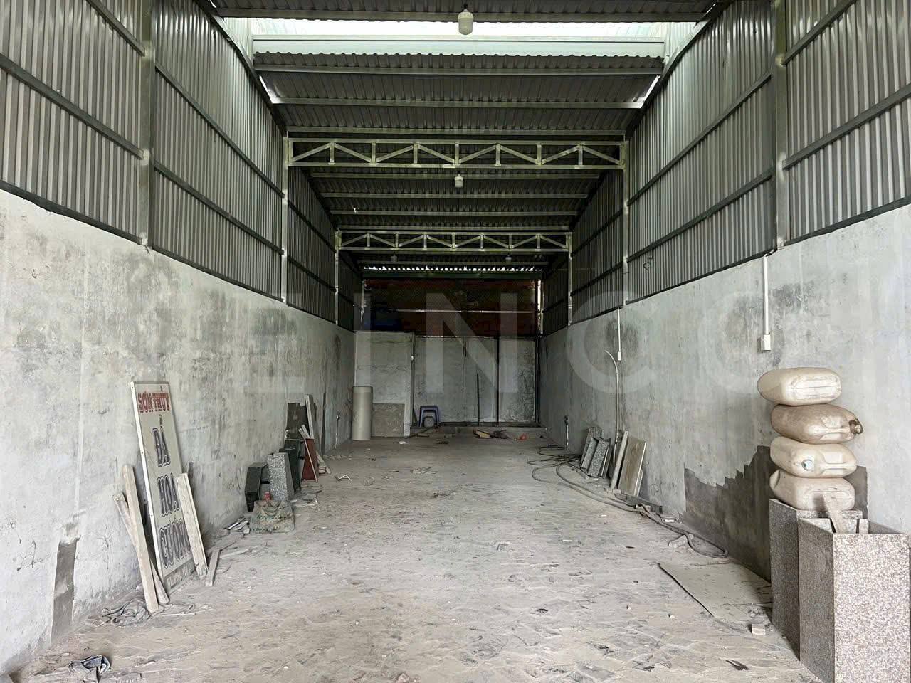 - Diện tích xây dựng 110m² (ngang 5m x dài 22m), là không gian trống suốt, có sàn bê tông kiên cố. Kho bao gồm 1 toilet và bể lắng phục vụ nhu cầu sử dụng cơ bản.